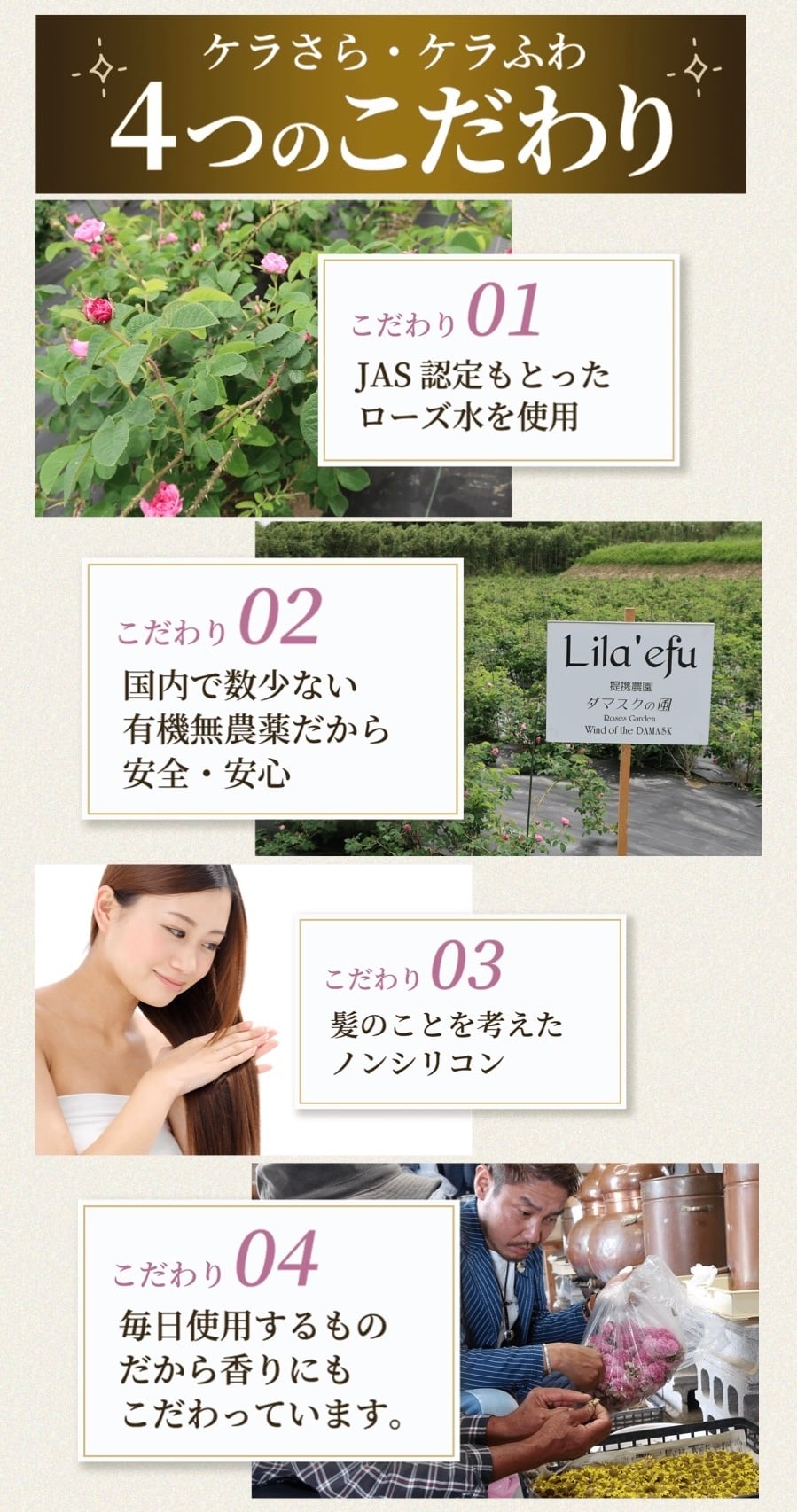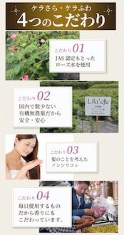 さらには活性酸素を除去してヘアカラーの褪色を防ぐ『ヘマチン』や、無農薬栽培のダマスクローズから抽出した天然ローズ水を配合。