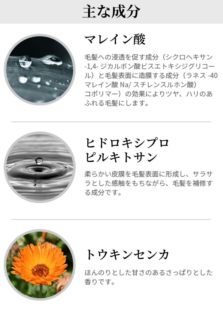 毛髪リペア成分である『マレイン酸(ジカルボン酸)』、髪と同じ成分である11種類のアミノ酸。
